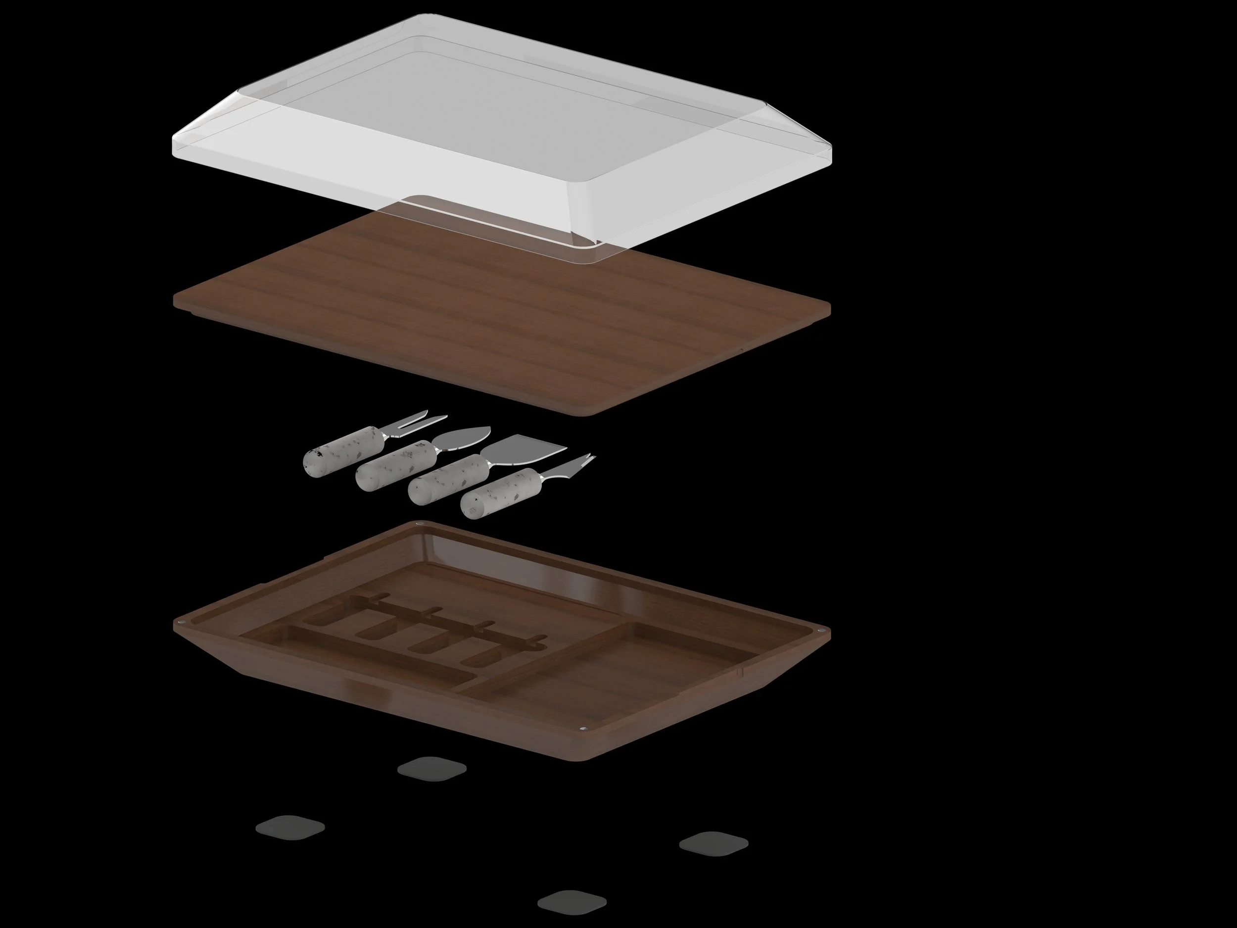 charcuterie board with included travel set of cheese tools, a space for napkins, toothpicks, and a lid to allow for pre assembled ARRANGEMENTS.